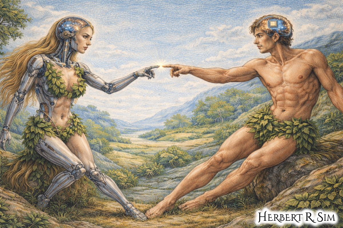 In my illustration above, referencing “The Creation of Adam” fresco by Michelangelo — I draw ‘Adam and Eve‘ trying to connect on a Cognitive Symbiosis, through their brain-computer interface Neurochip — The Merge of Man & Machine.