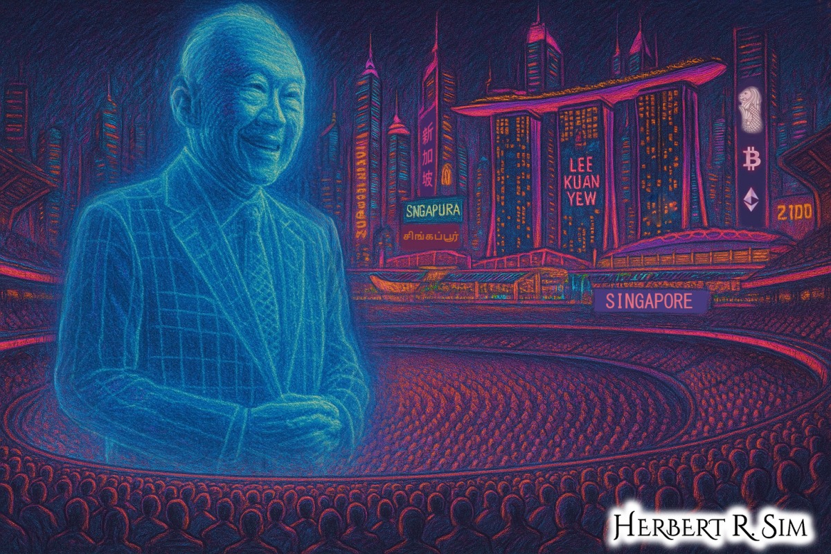 In my illustration above, featuring a futuristic stadium filled with people, watching a hologram of the founding father of Singapore – ‘Lee Kuan Yew‘ speaking to them. This art is an homage to the late leader of Singapore.