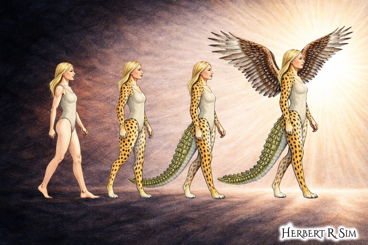In my illustration above, I showcase the human to animal-hybrid evolution, transcendence through genetic-editing, CRISPR technology, towards becoming a chimera — notice the cheetah limbs for speed and strength, crocodile tail for balance and as a weapon, eagle wings for flight.