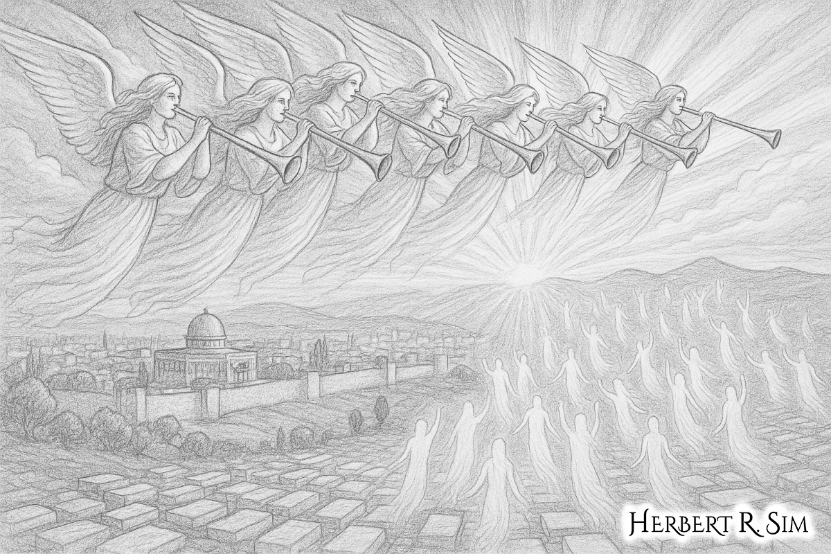 In my illustration above, I feature seven angels blowing on long silver trumpets above the skyline of Jerusalem (with the temple mount), the graves below shimmer as souls rise upward in light.